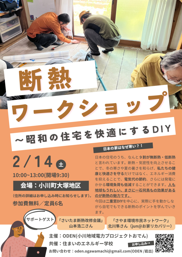 2/14(土)【断熱ワークショップ】@小川町 2026/02/01 カテゴリー:イベント 2/14(土)断熱ワークショップ@小川町 〜昭和の住宅を快適に〜 既に満員御礼となっております! 主催はODENさん(小川地域電力プロジェクトおでん) 私は断熱DIYのサポートで参加します。 健康に直結するのが、住まいの断熱! 一緒に楽しく学びましょう!